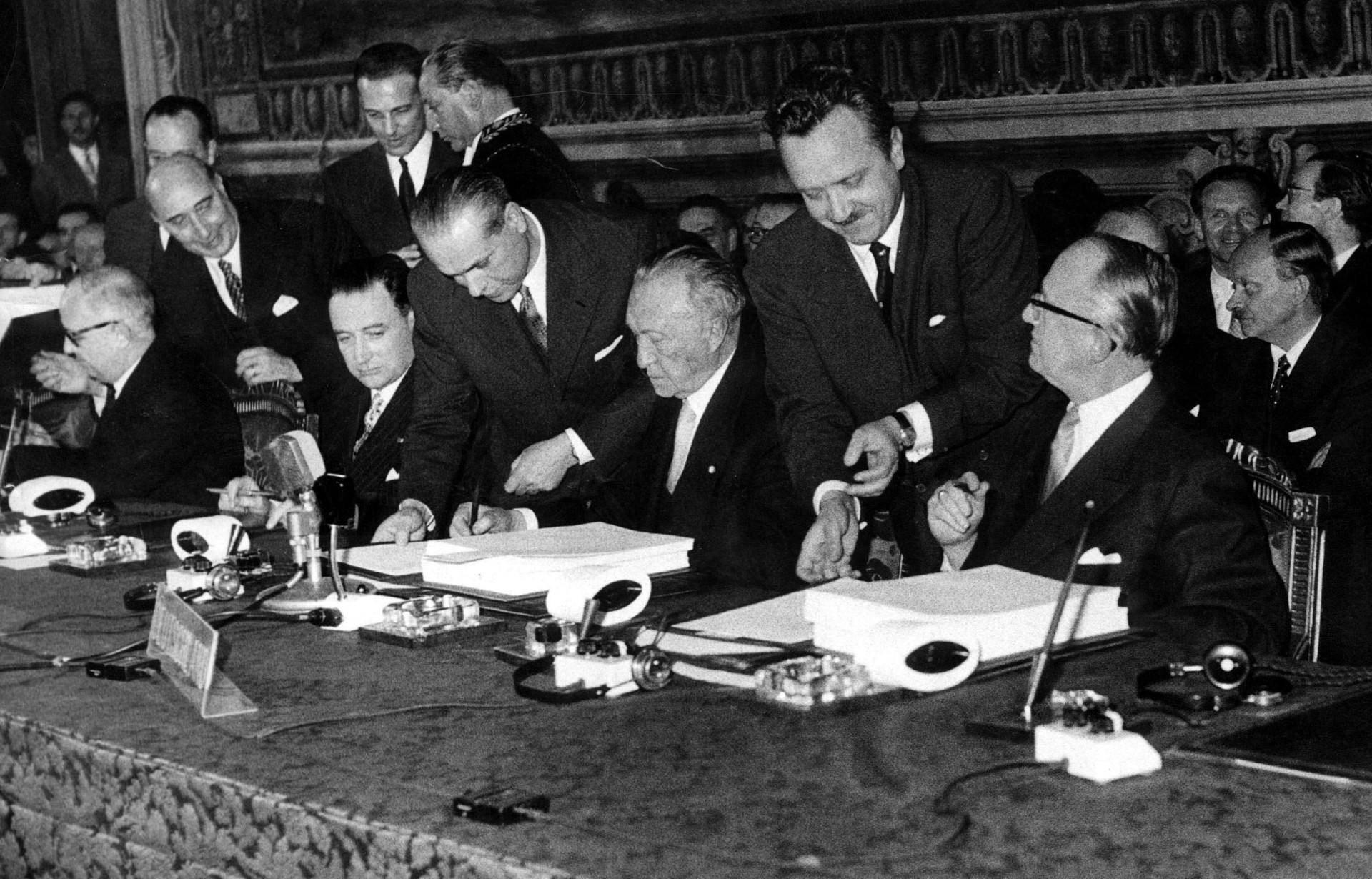 Smilende mænd i mørke jakkesæt med vandkæmmet hår. Året er 1957, og mændene - Europas ledere - har netop underskrevet Rom-traktaten, det vil sige fødselsattesten på det Europæiske Økonomiske Fællesskab (EØF). Det er derfor, de smiler. For EØF kommer til at knytte medlemslandede endnu tættere sammen blandt andet gennem toldfri samhandel. Fællesskabet rummer dog stadig kun de seks føromtalte lande - Belgien, Frankrig, Holland, Italien, Luxembourg og Vesttyskland.