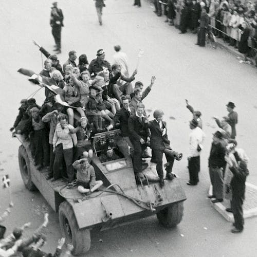 Rundt omkring i landet bliver der udvekslet undrende blikke og stirret intenst mod radioerne, der de næste 12 lange sekunder kun udsender en småknitren. Så lyder Johannes G. Sørensens stemme endelig igen: “I dette øjeblik meddeles det, at Montgomery har oplyst, at de tyske tropper i Holland, Nordvesttyskland og i Danmark har overgivet sig. Her er London. Vi gentager: Montgomery har i dette øjeblik meddelt, at de tyske tropper i Holland, Nordvesttyskland og Danmark har overgivet sig.” Med ét er fem års tysk besættelse er pludselig slut. Dér, foran radioerne, begynder det overvældende budskab at synke ind. Mørklægningsgardinerne rives ned og brændes symbolsk på gaderne over hele landet, hvor folk strømmer ud for at fejre friheden sammen. De tyske troppers officielle kapitulation i Danmark finder egentligt først sted morgenen efter, den 5. maj klokken 8, men det er der ingen, der går op i her på denne forårsaften og -nat midt i befrielsens rus.
