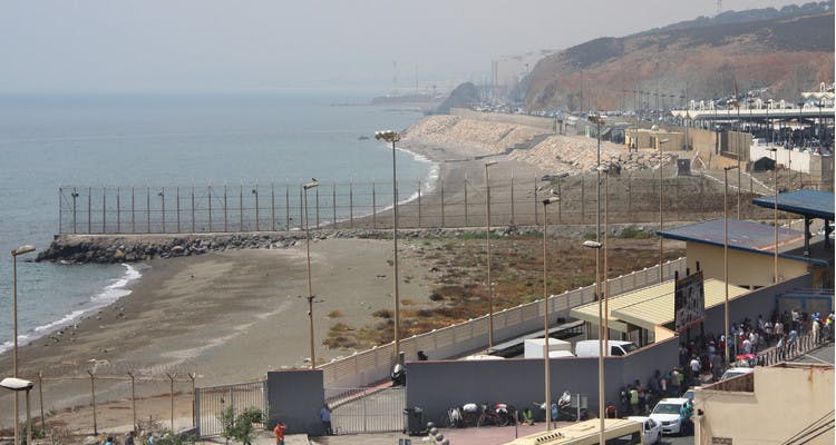 Grænsehegn mellem den spanske enklave Ceuta og Marokko. Hegnets primære formål er at holde illegale migranter ude. Grænsen mellem Marokko og de spanske enklaver Ceuta og Melilla udgør de eneste landfaste grænser mellem Europa og Afrika. Foto: Miro9966 via Dreamstime.