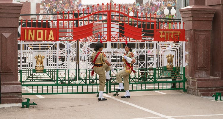 Grænsemuren mellem Indien og Pakistan ved en flagceremoni. Grænsemuren her er et eksempel på en mur, der har ændret formål over tid. Foto: Shutterstock.